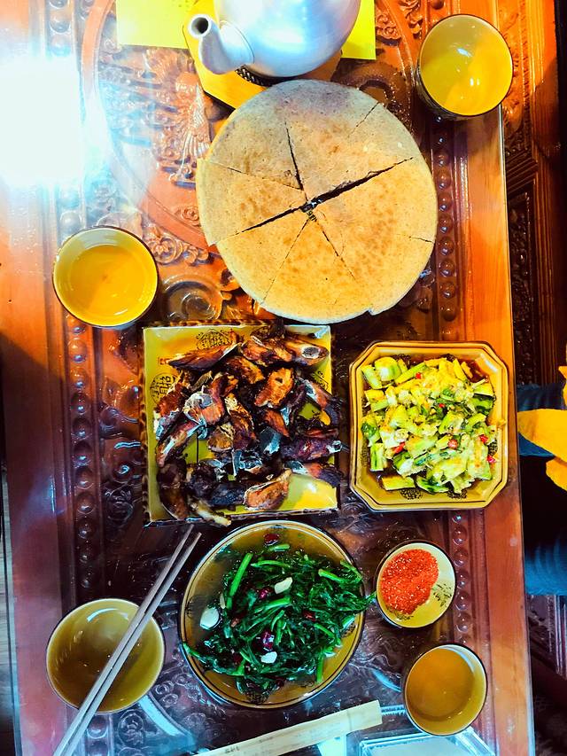 姐姐推荐的青稞饼,外焦里软,特别好吃。来的路上就嚷嚷着要吃藏香猪,点了一份炭烤的,这个肉简直太香了,裹上辣椒粉,更能增加猪肉的香味,一定要趁热吃。吃完猪肉,来上一口拍黄瓜,清爽解腻,再来一口清茶,简直是绝配。