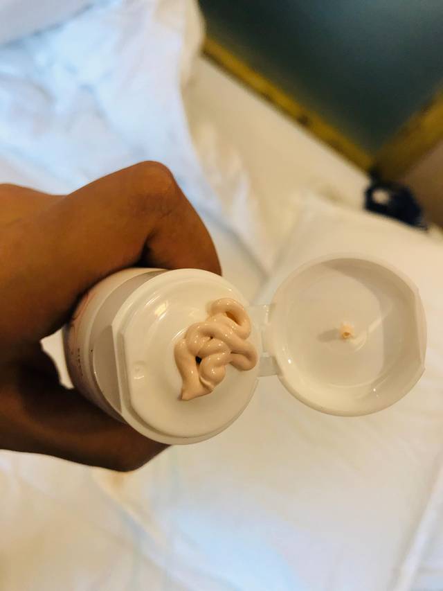 所有的管状的化妆品都是这样,一开口,自动就出来了,哈哈。我们俩也感觉整个人都肿了一圈,尤其是眼睛,又酸又胀的。