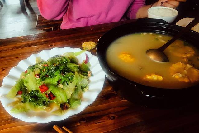 点了一个牦牛锅,一个炒青菜,我只想说怎么能这么好吃。先说汤,里面有各种菌类、耗牛肉、玉米,汤底非常浓郁,香而不腻,喝上一碗感觉全身暖暖的,特别舒服,唯一的不足就是耗牛肉有点嚼不动。青菜里面放了辣椒和好油,大火爆炒的非常入味,我一个不爱吃菜的人,最后把里面的蒜末都吃干净了,哈哈。