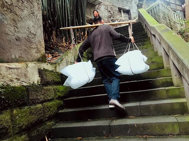 导出都能看到这样挑着担子的人呢,还有很多年纪都很大,这里都是山路,刚下过雨又有点滑,我们不拿东西走起来都有点费劲。