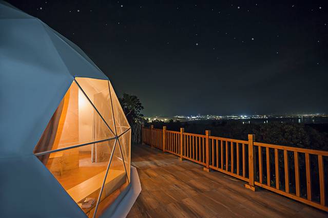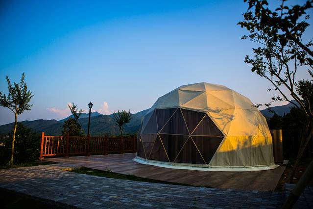 我们预定的是观星帐篷。在房间的大圆床上,透过透明的墙,我们可以看到蓝天绿水,青山舒张,确实十分地赏心悦目。