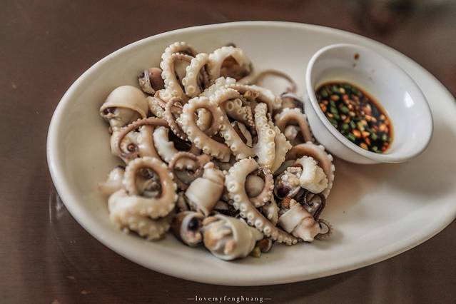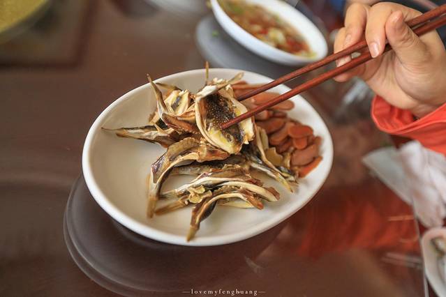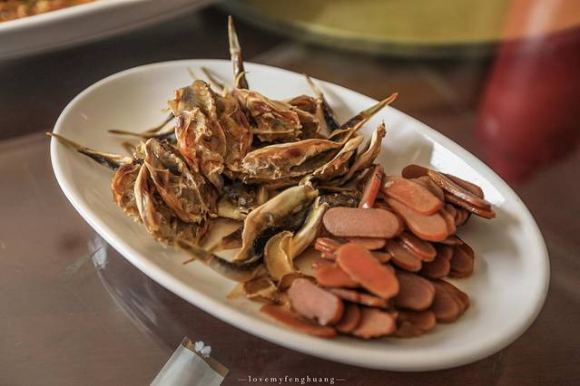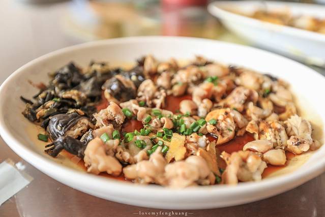 白灼鱿鱼、蛏子、牛蛙,搭配简单的酱料,非常的新鲜。晒成鱼干的河豚肉,不但利于保鲜,这样的方式还去除了鱼的毒性,最重要的是营养丰富,还有鱼籽,满满的高蛋白。