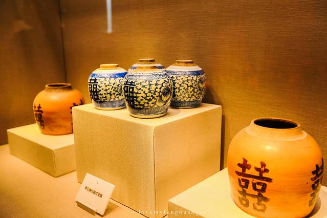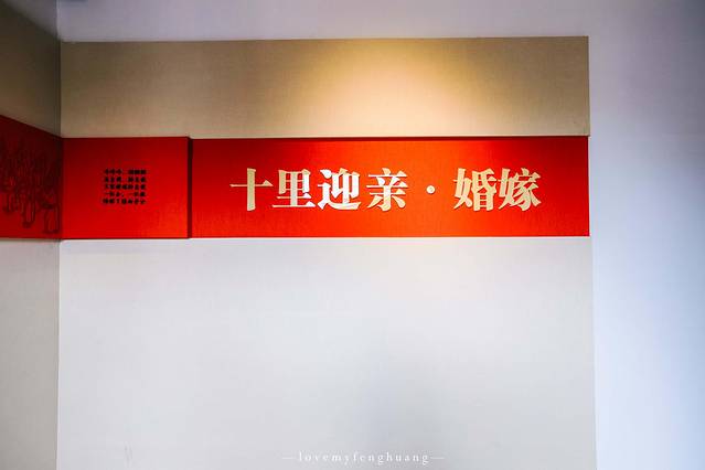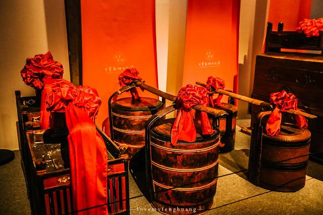 这个展厅就展示了迎亲的“礼”,到处红彤彤、金灿灿,让人目不暇接,有青花缠枝囍纹瓷罐、朱漆素纹二斗床前橱、朱金木雕人物故事纹梳妆镜箱、朱漆素纹高提梁桶、朱漆描金花边形果盘、就连饭桶上都雕刻着福禄寿纹,实在精湛。
