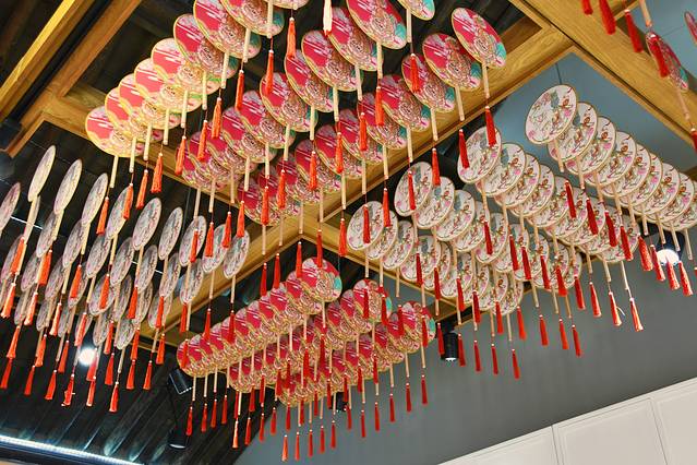 进入店中,中式古典的装修风格,蒲扇吊顶,红纱幔帐。
