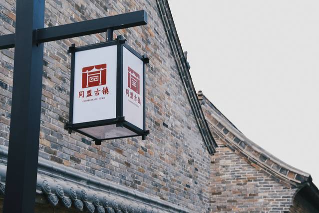 匾额上写着 “ 同盟古镇 ” 四个字,