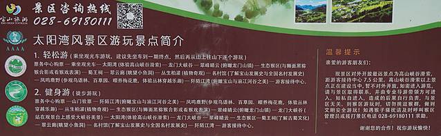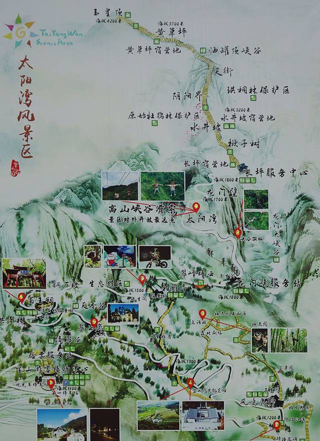 太阳湾位于彭州宝山县,是龙门山脉的一支,气势既秀丽,又雄伟,而且与古蜀历史有关。从地图上看,景区第一期工程只开放到龙门大峡谷所在的1600米高的太阳湾,再往上尚待开发,需申请经批准后由专人带到海拔4200米高的“玉皇顶”,不知有生之日还能去到否?不过第一期工程已经很有看头了,我在图上红圈中标了1到9的序号,这里依序介绍。