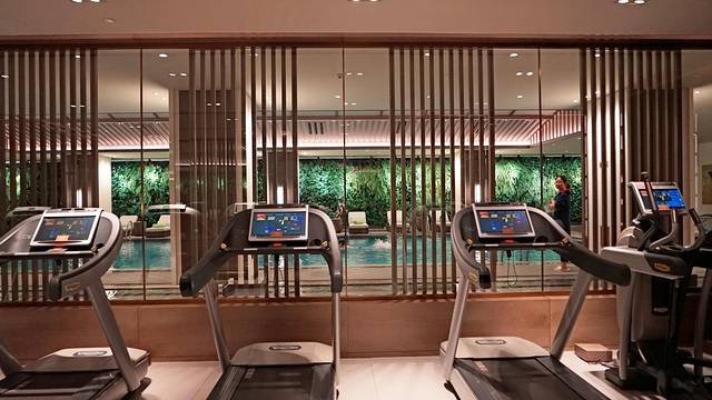 健身中心采用国际先进设备,从健身房向外望去,可以看到一面绿意盎然的植物墙,游泳池在地下一层,就有如置身户外游泳池一样放松。