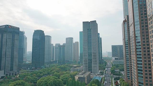 站在空中花园可以俯瞰整个钱江新城的CBD景色,高楼林立。