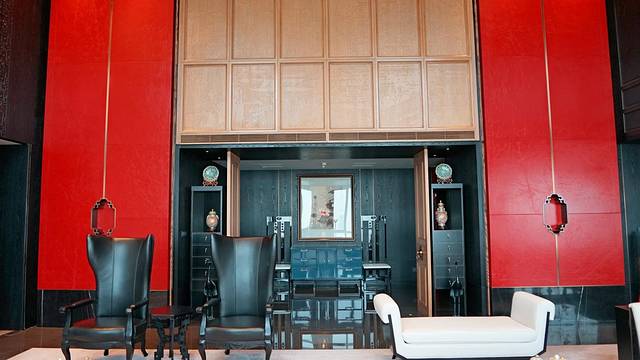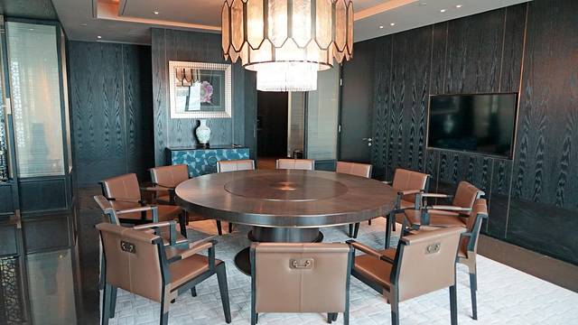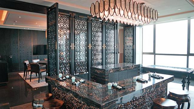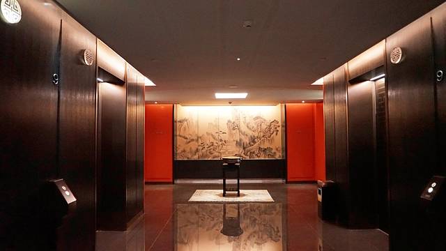 260平米的场地被设计成府邸会客厅,配有中式家具,用餐区可放置24人圆桌,从这里可眺望钱塘江江景,两台从一楼直达的电梯为贵宾提供私密的用餐体验;