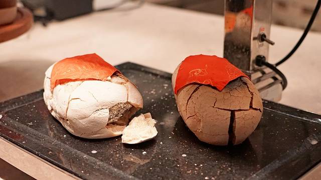 济公菜可谓餐厅一绝,经腌制的鸡肉用荷叶包裹,再用调过味的面浆裹住进行烘烤,当服务员打开被烤得脆脆的面皮时,香气四溢。