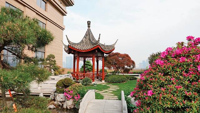Villa Hangzhou也位于18楼,这里提供驰名中外的钓鱼台菜,从这里可以漫步到毗邻的中式空中花园,这座680平方米的江南园林,小桥流水、亭台楼阁一应俱全,是举办私宴的绝妙场所。