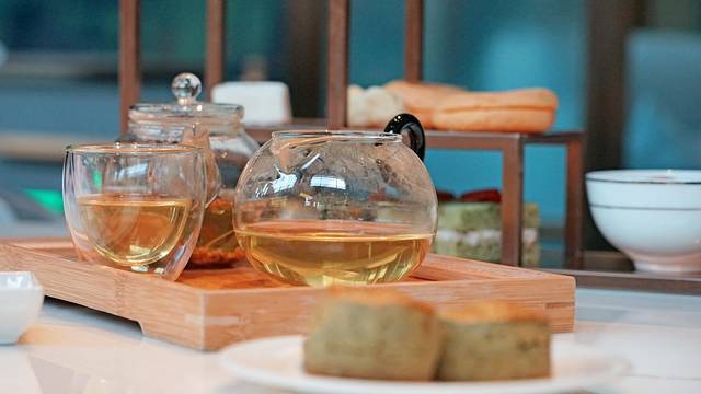 酒店的下午茶极具特色,注重选用本地食材制作西式糕点,并根据季节的不同,推出用莲藕、莲子、龙井茶、西湖菱角等制做的小点。