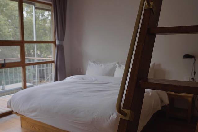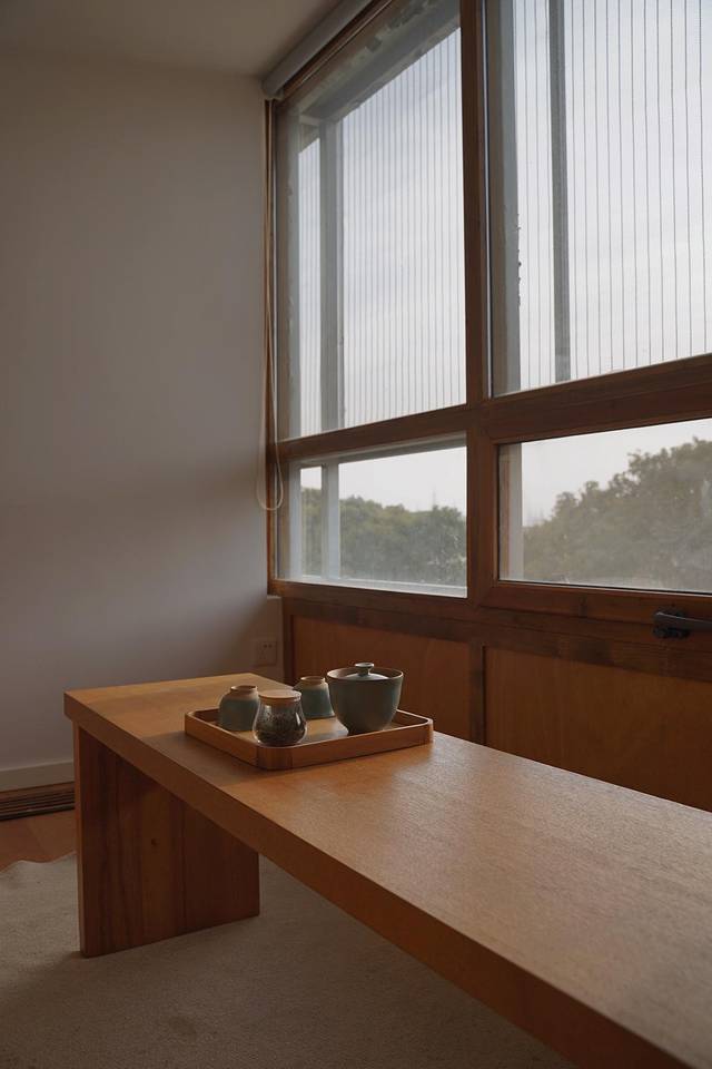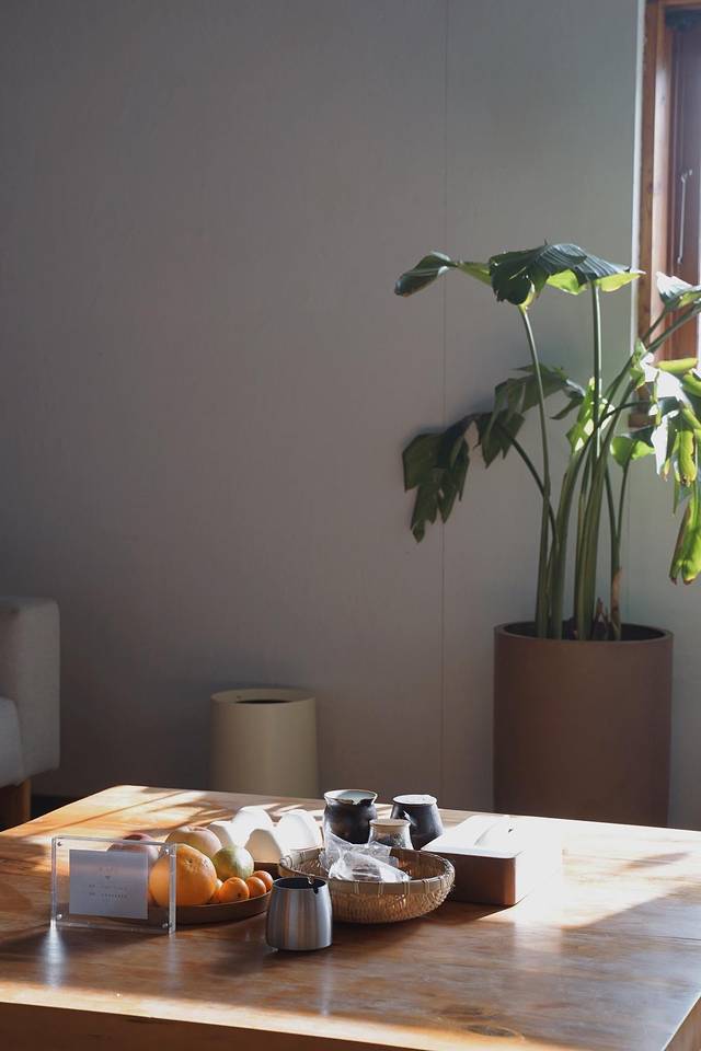 纯白的墙壁、原木色的家具、纯白的床品......房间阳光充足,透进来的光线洒在床上,也洒在榻榻米茶台上。在这里饮一壶热茶,享受难能可贵的冬日暖阳。