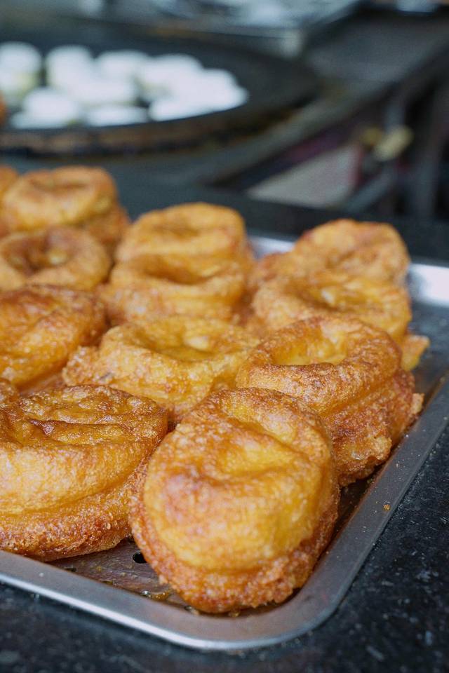 这里的油墩和浙江的并不一样,有咸甜两种口味,咸的是鲜肉馅,甜的是豆沙馅。一个个金黄的糯米面团在油温的滋养下结出酥脆的外壳,一口咬下,肉馅的汁水涌入口腔。