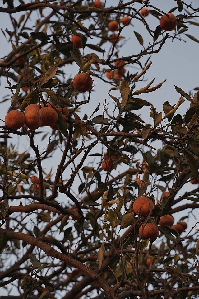 四通八达的碎石路仍在,路边的橘子树上依然硕果累累,无人采摘只能寂寞地悬挂在梢头,被一日接一日的暖阳炙晒。灰暗,干瘪,带着些许斑点,就像树下那位老人的皮肤。