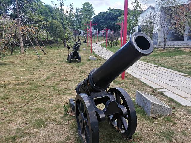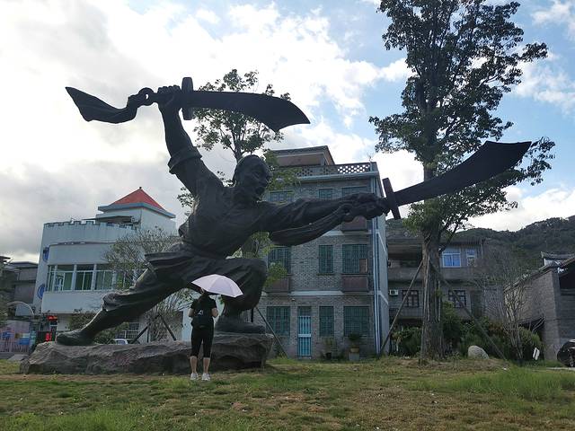 爱国英雄陈明良雕像,采用铸铜工艺铸成,再现陈明良英勇杀敌的瞬间,体现民族英雄奋力抵抗敌军的英勇气度。雕像高5.6米,整体长约10米。