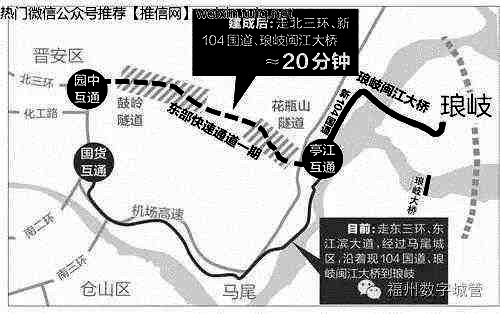 新104国道晋安连江段,京福线的一部分,2020年1月22日通车。其中,始于园中互通,穿鼓岭隧道(5351米)、闽安隧道(4339米),跨白眉大桥、前洋大桥,再经东盛隧道、东盛大桥、洪塘隧道,抵达亭江互通,这段誉称东部快速通道一期。