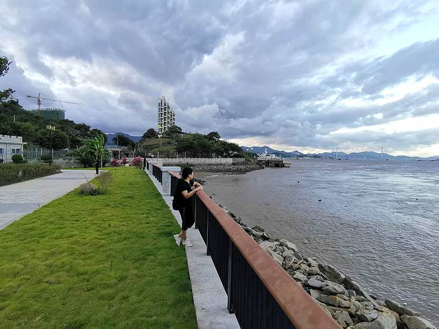 炮台公园门口的邻江公园还有一些市民,远处的一幢高耸的建筑很显眼,真正的海景房呐~