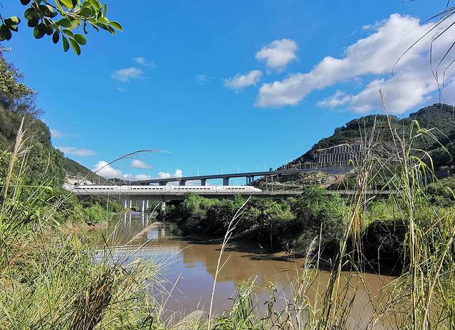 邢港河上方,新104国道之东盛高架桥与福厦动车线同框,停车拍照时恰遇动车入框,蛮具美感的有木有?