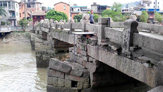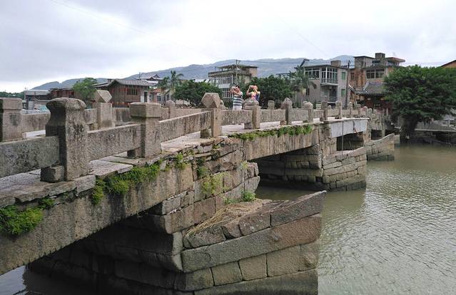 全长66米,宽4.64米,四墩五孔,不等跨,罕见的船形桥墩,两头尖,花岗石平梁结构;
