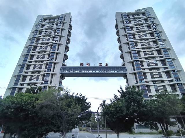 这高耸的建筑是一楼盘呀,12层的高空廊桥好壮观,算亭江镇的地标吧