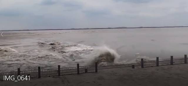 下午一点四十左右,大潮如约而至。虽然没有我在电视上看的那么凶猛,但是身临其境的感觉还是很震撼的,平静的江面瞬间变得波涛汹涌,浪声滔天。