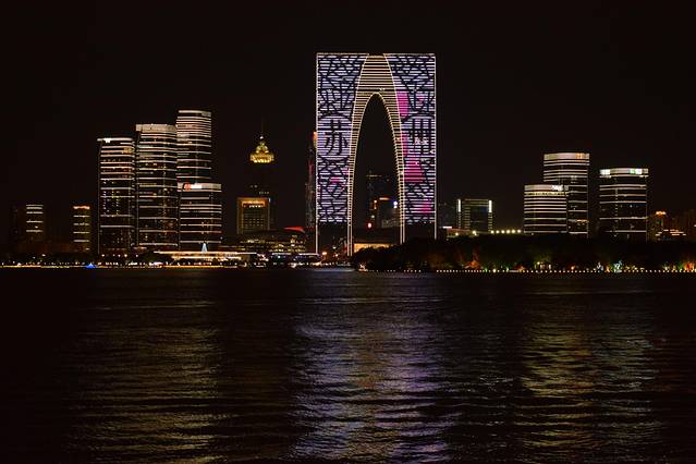 从月光码头沿着金鸡湖边走,一会就看到了东方之门。