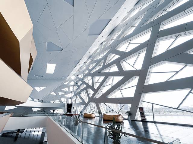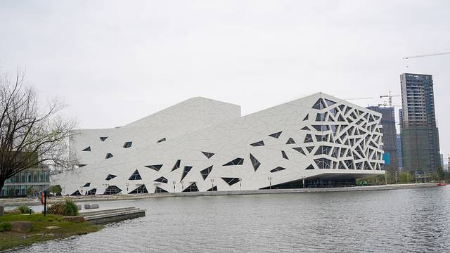 大剧院依水而立、穿水而建,拥有独特的冰裂纹造型和倾斜的房顶,远处看起来就像是艘船。