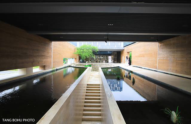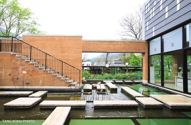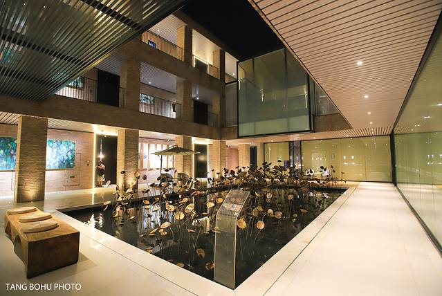 酒店大堂宽敞明亮。在对面还有一处陶瓷的作品,环绕一室的静谧。走出侧门就来到了酒店中庭,这是一片静谧的艺术荷塘。带着 景德镇 印记的旧窑具匣钵盖,和见证城市发展变迁的废弃钢筋新的生命。