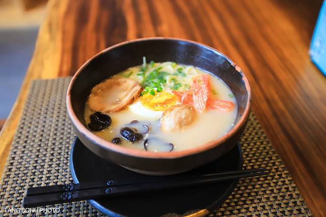 中午就在马鞍岭一家日式风格的餐厅吃起手面了,一进店就能看到书架上放着好多书,装修风格比较清新,客厅里灯光是暖色系,在这里吃饭比较温馨,没做一会儿美食就上桌了,我们先是吃面,一看就是比较日式风格的美食,面里的汤不错,比较浓厚,味道香。