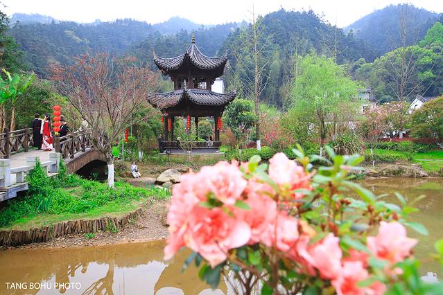 三宝村的马鞍岭景区就像是世外 桃源 一样,一条长长的小溪穿过村子,两边是森林包围着,这里有小桥流水,绿树郁郁葱葱,樱花盛开。景色迷人,环境幽静。小伙伴们来到了一座小桥边都在这时机拍起了古装照来了,大家玩得不亦乐乎的。万万没想到,有几个小伙伴走到了小溪对面的去拍照。