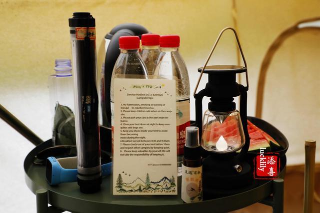 在帐蓬内还为各位探险家们准备了野用灯、驱蚊水等简单的用品,因为帐篷在水杉林中,所以不用担心酷热,帐蓬内有电扇,到了晚间睡觉还会凉到需要盖被子。
