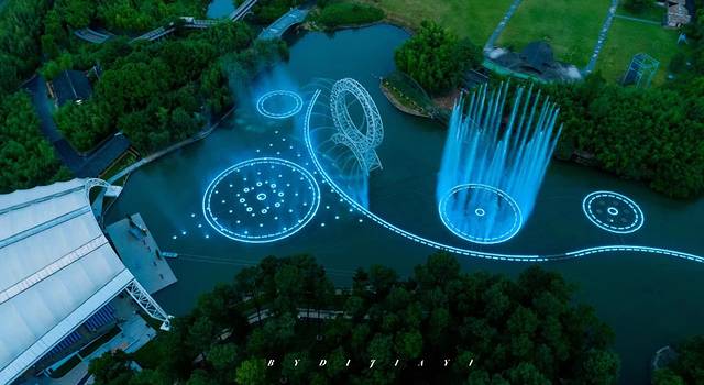 水影秀的主舞台在湖面上,属于升降式构造,湖内打造了各种音乐喷泉,有龙腾九州、众志成城、红红火火、水上芭蕾、龙行天下、芙蓉花开、云雾缭绕等,晚上灯光闪耀,如梦如幻,一下子就把人带入了情境中。