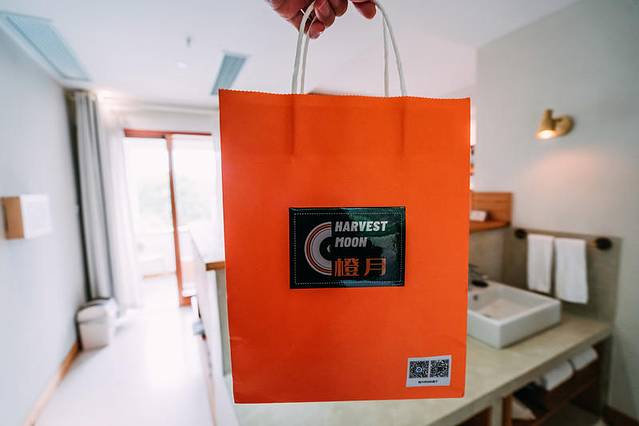 连洗漱用品的袋子里也沿用了橙月和黑胶唱片的元素,特色非常的鲜明。
