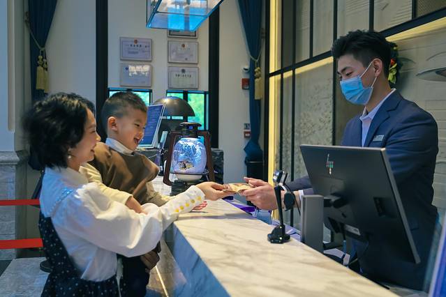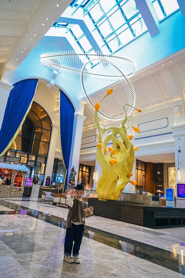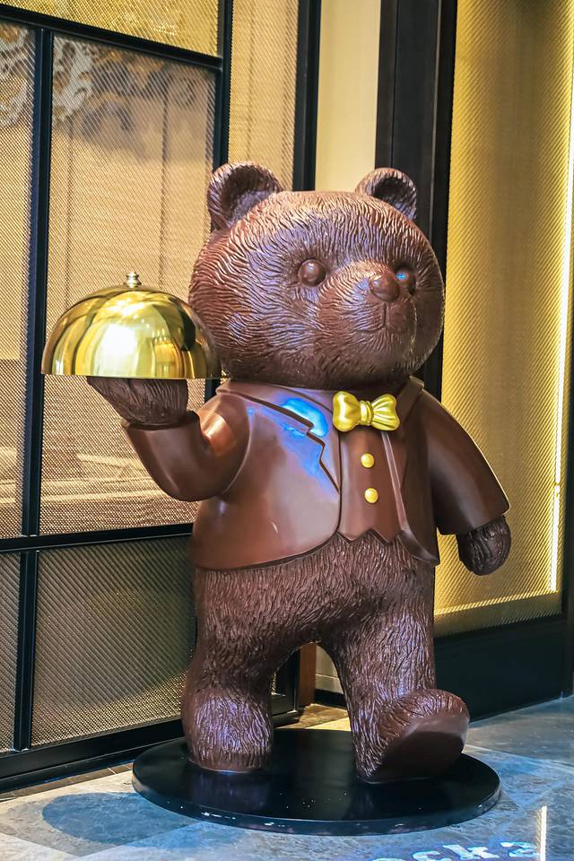 进入「 英德奥园希尔顿逸林度假酒店」,明亮奢华的大堂让人眼前一亮,而巧克力主题元素也融入其中,如大堂一侧的巧克力熊玩偶就让人印象深刻,办理入住期间迎面而来的欢迎曲奇,带着可口的巧克力味道,睿睿很喜欢,也很贴心。