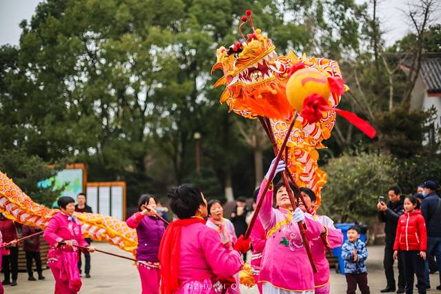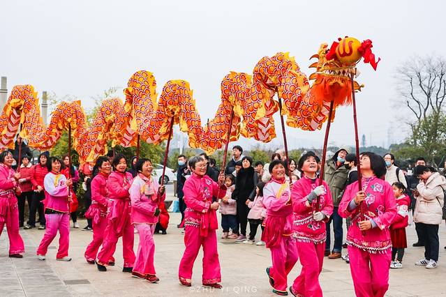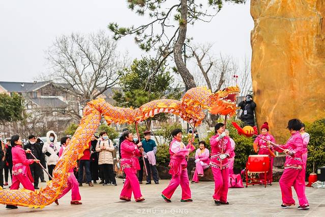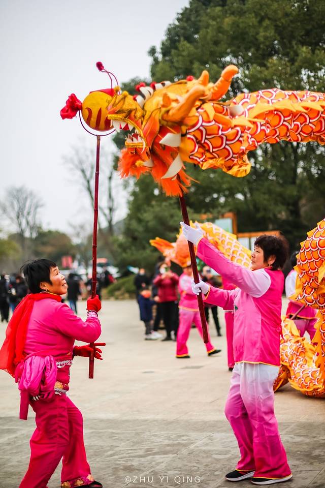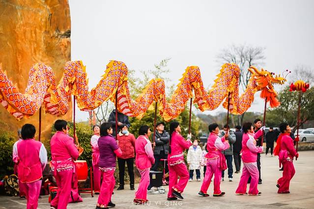 一到山门口,就感受到浓浓的年味,热闹的北门广场上,龙腾虎跃,锣鼓喧天,来自穹窿山里的民间舞龙队,在寒风中为我们带来精彩的舞龙民俗表演。