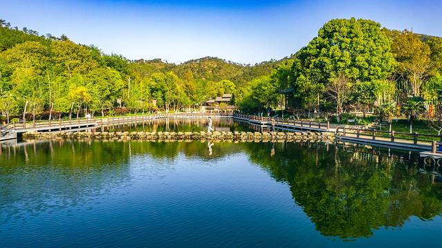 走在野村谷,春天的气息扑面而来,眼前是碧水绿树,耳边是白鸟欢唱,“青山不老,绿水长存”,湖面上金光闪闪,万株银杏与近千株近70公分的大树就像整齐列队的士兵一般,英姿飒爽。春天带来了明媚的阳光、和暖的春风,一阵风吹过,湖面涟漪连连,柳叶低垂摇摆,偶有片片落叶如蝴蝶起舞般飘落进湖面,总之野村谷的春色总是多情的,银杏、大树、桩景、小树林组成的错落有致的美丽风景,如痴如醉。