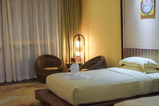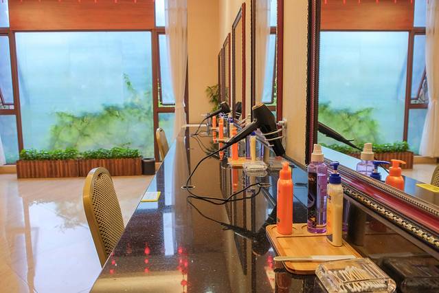 馆内设有室内水疗SPA 馆及大型室内游泳池及干湿蒸房供客人使用,内部壁画装饰采取典型的敦煌风格,全馆主体色调看起来温馨舒服。