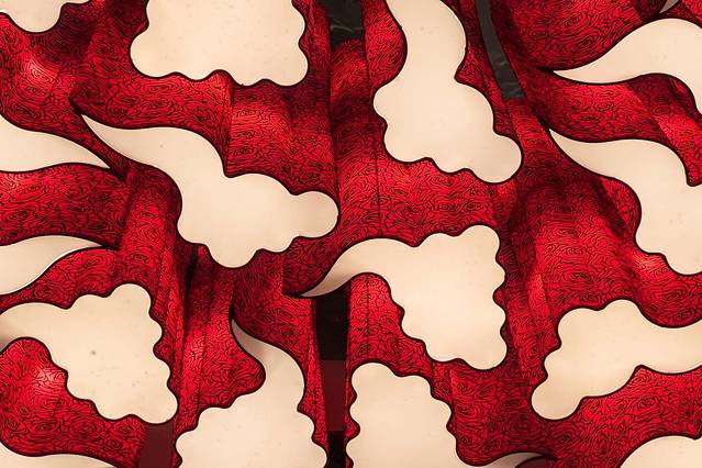千佛袈裟是罕见的唐代传世刺绣,绢底呈杏黄色,上面绣有一千个佛像,佛像全部为结跏趺坐式,口、鼻、眼和发髻清晰分明。用金线绣出形象,然后以蓝色、浅蓝色、朱红色、黄色丝线陪衬,再绣蓝色背光。四周是十二条形象生动的蛟龙。