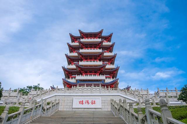 韶阳楼共五层,高42.8米,主次分明亚字形,五行五层十二丈,楼内有古塔基遗址、韶州城模型、韶关市博物馆馆藏文物图片等专题展览,是了解韶关这座城市必游览之地。