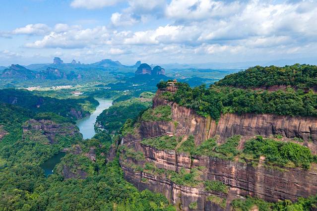 丹霞山由红色砂烁岩构成,以赤壁丹崖为特色,因"色如渥丹,灿若明霞"得名。地质学家以丹霞山为名,将这一地貌命名为“丹霞地貌”。