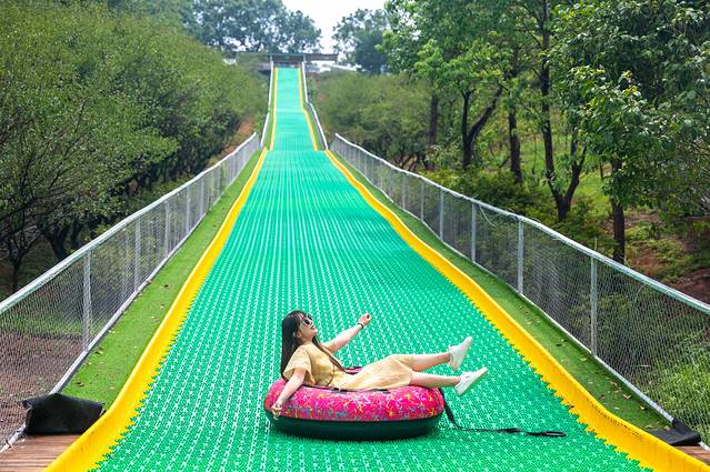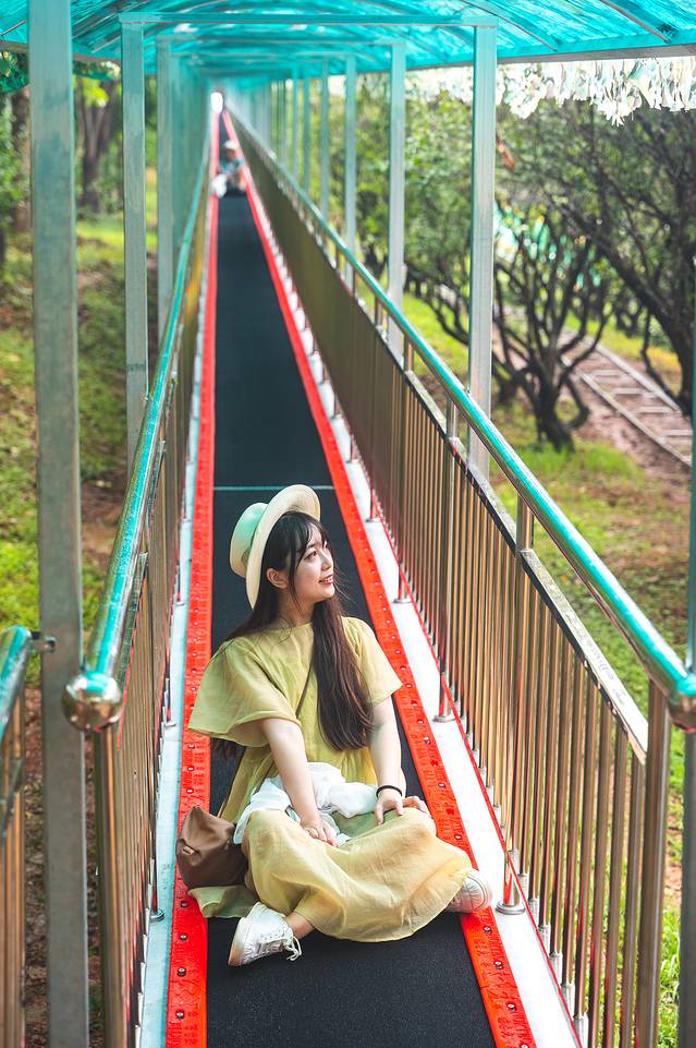 这条绿色滑道真的超级长,堪称“陆地版的激流勇进”,从高处一滑而下,耳畔的呼啸的风,眼前的景色也瞬间模糊了起来,还真有那么一瞬间有一些身体失重的感觉。