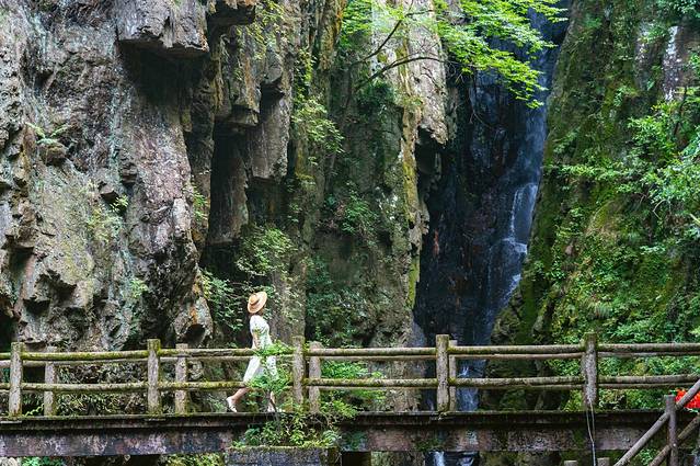 幽潭前有一桥横跨其上,游人漫步其中,还别说,那画面看起来有一种诗情画意般的意境美。