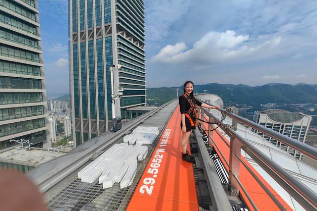 全新的橙色跑道,真的活力满满,在蔚蓝的天空下,超级炫酷!还印有大大的“重庆”字样,步道上可以欣赏整个重庆的美景,两江四岸最佳观赏位!全程都有安全绳和保护措施,开心去冒险吧~