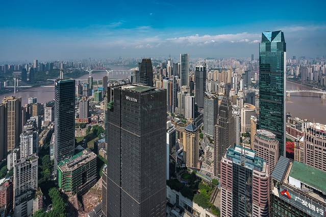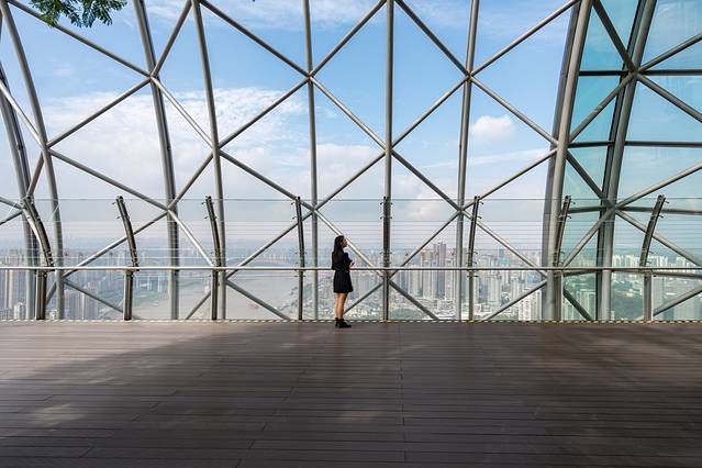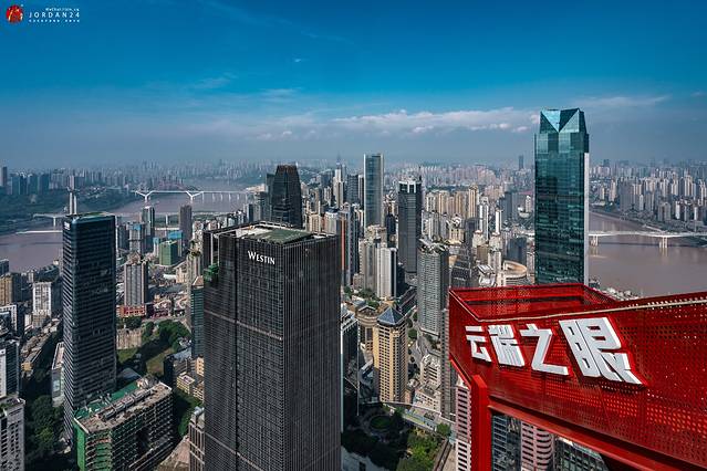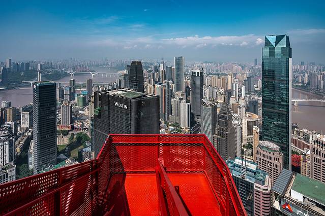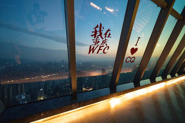 这里能俯瞰整个渝中半岛,抬头就是双子塔和你示意。江北嘴的繁华直击视野,来福士大楼就在你身后默默注视着你。520米的高空,360°的全方位无死角的视野。