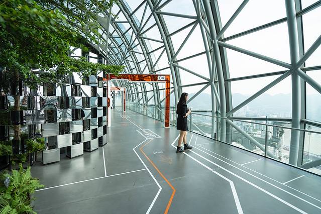 探索舱.观景台再往上还可以到水晶连廊的顶部,迈一步登顶水晶连廊,这可是360°全露天观景平台“Skywalk 云中漫步”