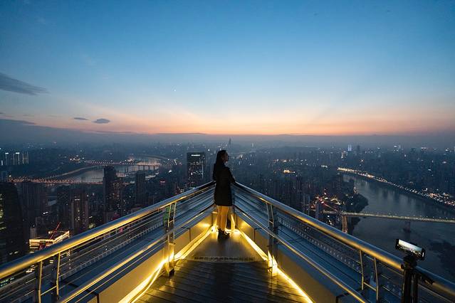 真的是无夜景不重庆!太阳一落山,晚霞和城市灯光层层叠叠简直太美了,站在75楼仿佛遥远的天际触手可及。