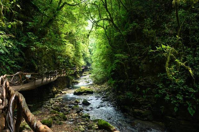 而我去的则是A线,通过桃溪谷与外界的唯一通道——鸳鸯廊桥后,一路自然风光旖旎,亿年光阴雕刻的奇石褶皱与峡谷浑然天成,就仿佛进入了原始丛林。