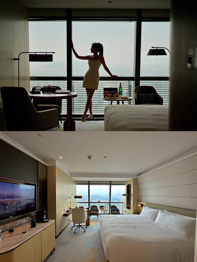 大堂的景观就已经无敌了,而客房则在44-65层,视野更广。内饰融合了豪华游轮客舱的概念,还有景观浴缸、戴森吹风机,所有的小细节都很贴心。