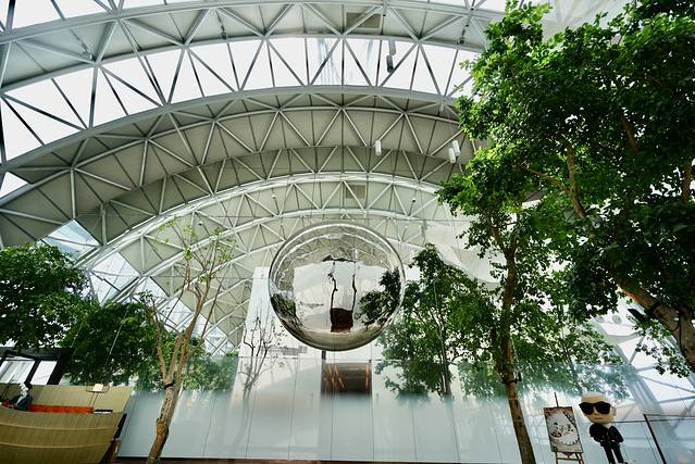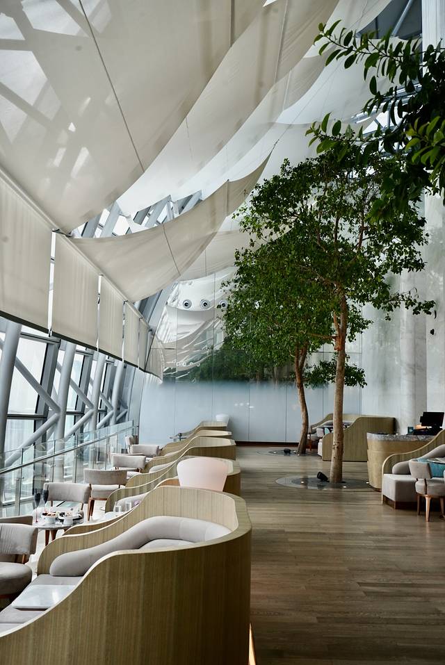 如果想逛来福士,住在楼上的洲际酒店是最方便的。酒店的大堂在来福士42楼,被一片自然鲜活的绿植和大树包围着。